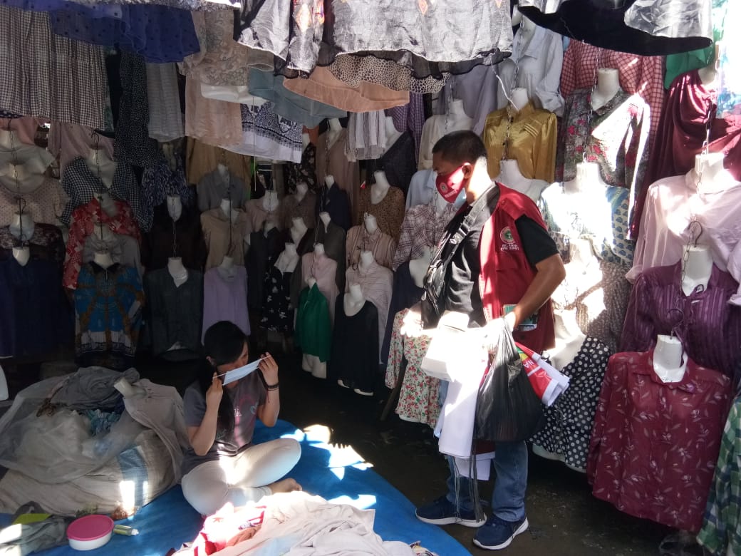 Dalam kesempatan tsb ibu lurah menyampaikan bahwa para pedagang di pasar tsb sdh dilakukan pembinaan utk selalu pakai masker, tetapi krn hari panas terik pada siang itu, Masih banyak para pedagang & pengunjung yang belum memakai masker. Saat para relawan bertanya, mengapa tidak pakai masker, serta mengapa masker di lepas, mereka menjawab, karena panas yang menyengat, membuat terasa sesak, bila pakai masker.