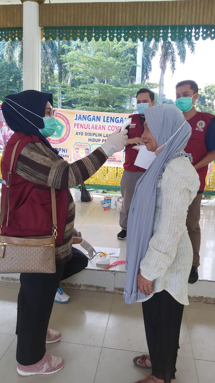 Para relawan Dpw ppni sumut serta para relawan Covid-19 Ppni sumut, bersama sama melaksanakan pengabdian rutin, dengan berbagi tugas.Mulai dari mengatur baris. antrian, mengedukasi cuci tangan yang benar, mengukur temperatur, mengukur tekanan darah, serta Spo2. Menyampaikan untuk tetap ikuti protokol kesehatan pencegahan penularan Covid-19,Cara memakai masker dan mencuci masker.Membagikan leaflet dan masker.
