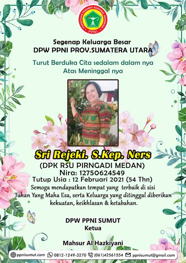 Kepergian Mendiang ini menambah jumlah korban jiwa Perawat Sumut suspect & terkonfirmasi Covid-19 yang ke-4. Semoga Keluarga, sahabat, mitra kerja mendiang mengikhlaskan kepergian nya menghadap sang pencipta , diberi kekuatan & ketabahan serta memaafkan kekurangan maupun kehilafan selama mendiang hidup. Kepada para teman sejawat perawat dan tim medis serta pihak pihak yang berjuang selama mendiang dirawat, melalui kesempatan ini, ketua dpw ppni sumatera utara, mengucapkan terima kasih yang tak terhingga, semoga pengabdian mereka menjadi amal ibadah serta tetap semangat menjalankan misi kemanusiaan merawat pasient terdampak pandemi covid-19.